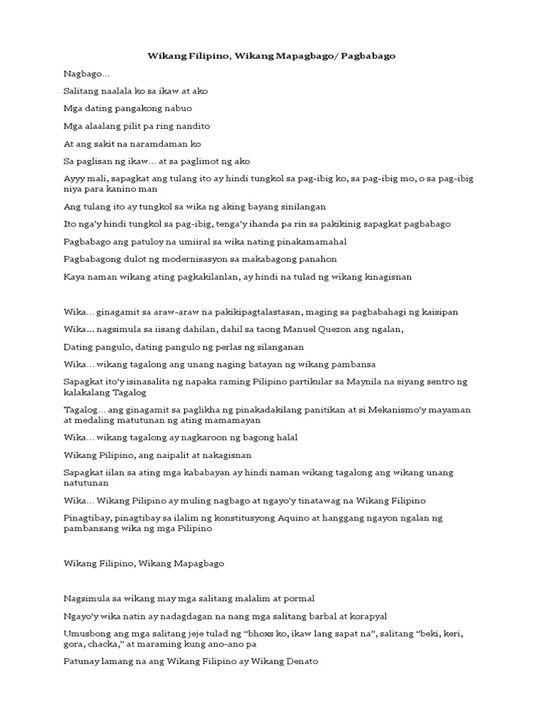View spoken poetry tungkol sa wikang filipinodocx from EDUCATION 237 at Batangas State University. Itinatatak sa isip mo. Sa palagay ko ay yun din yung nais nilang ipahayag sa atin sa tuwing binibigkas nila ang bawat salita nila sa entablado.