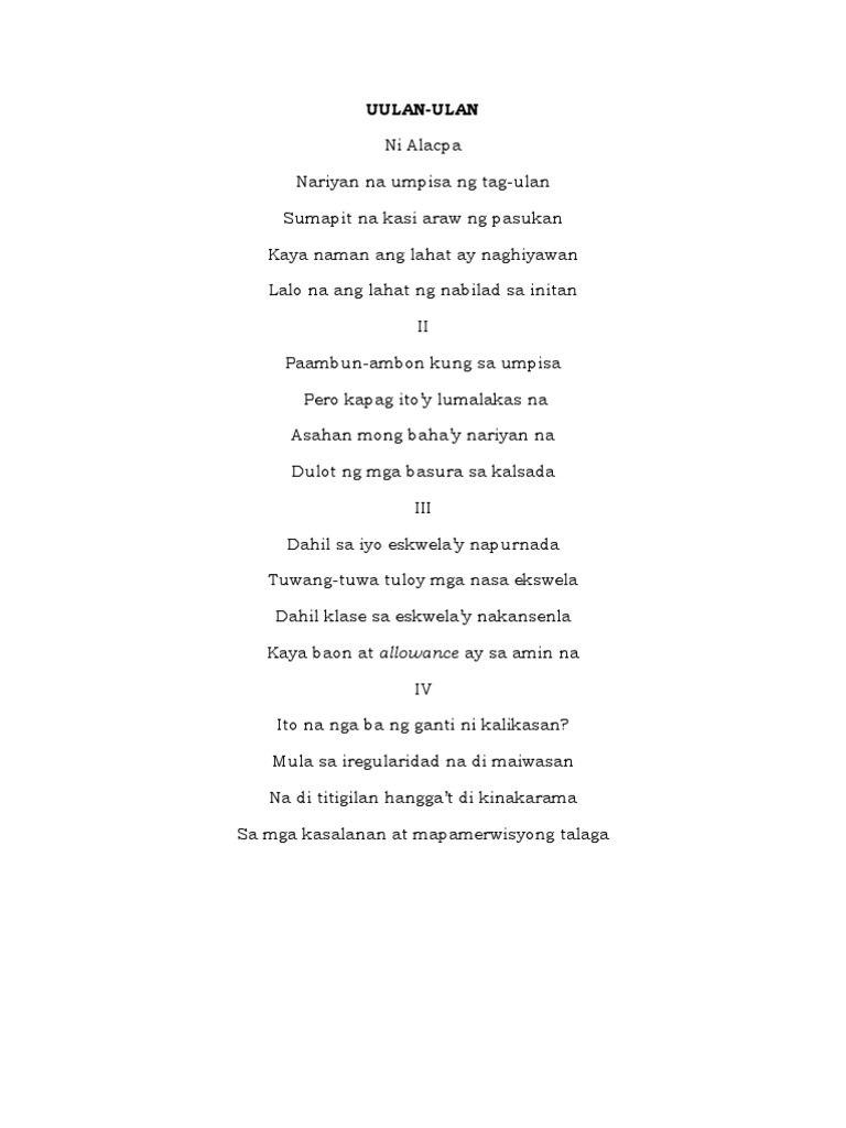 Ibat ibang uri ang kinakaharap natin isa pang halimbawa si duterte dahil parang nagiging katulad na ng stratehiya ni marcos ang pamumuno ni President R. Nagtatakbo ako sa mga taong mga basuray kinakalap Ngunit mga taoy bingi-bingihan sa aking pakiusap. Koleksiyon ng mga tula sa wikang.