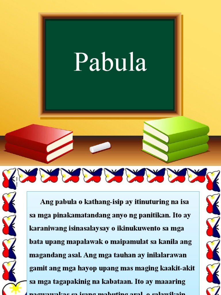 PABULA Nagagamit ang mga kuwento at aral na taglay ng mga pabula sa pagtuturo ng. Ang mga aral at kaisipan na ito ay magtuturo ng tamang leksiyon lalo na sa mga bata. Palagi silang nag-uusap lalong-lalo na tungkol sa sobrang init ng panahon.
